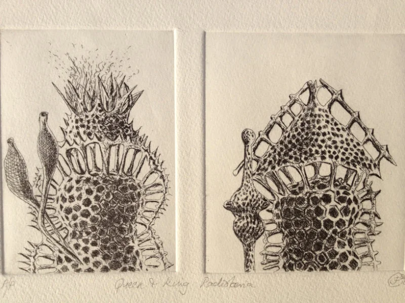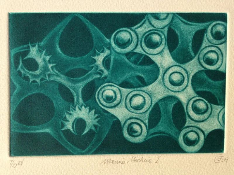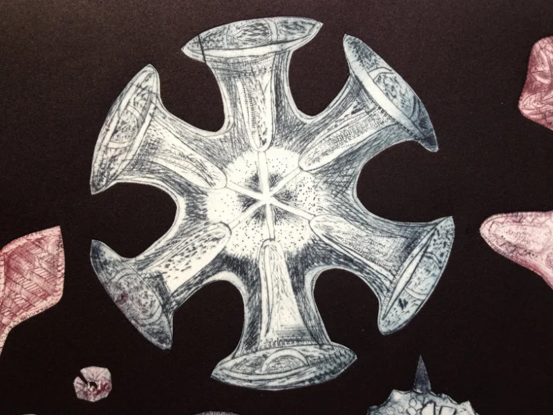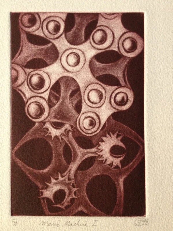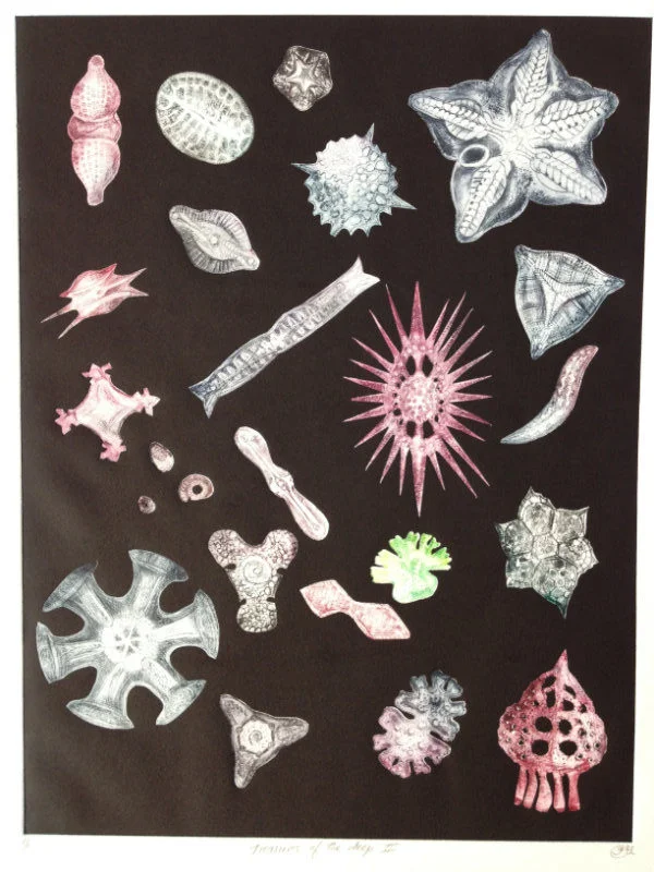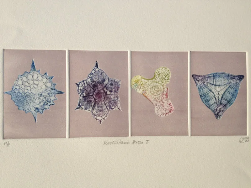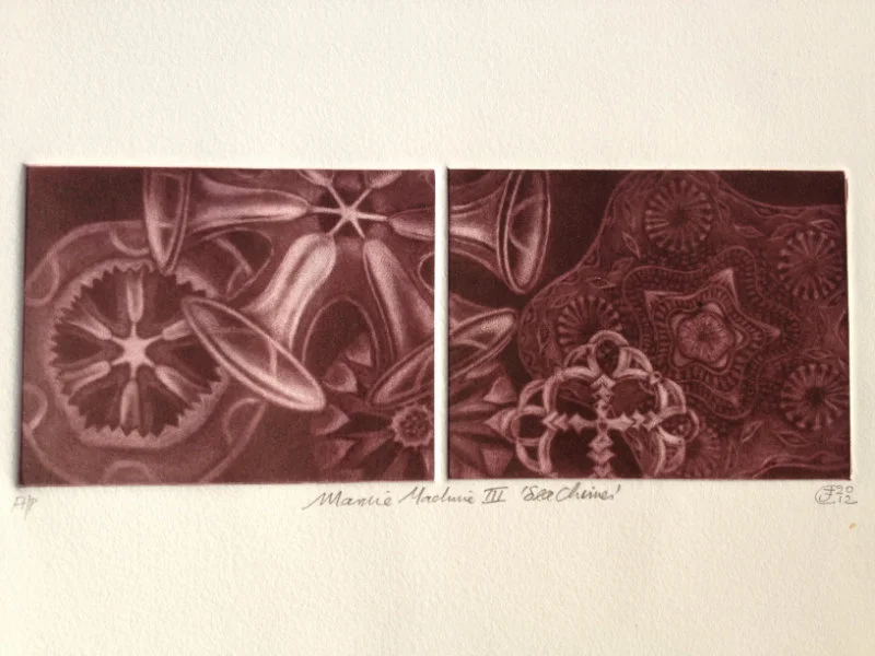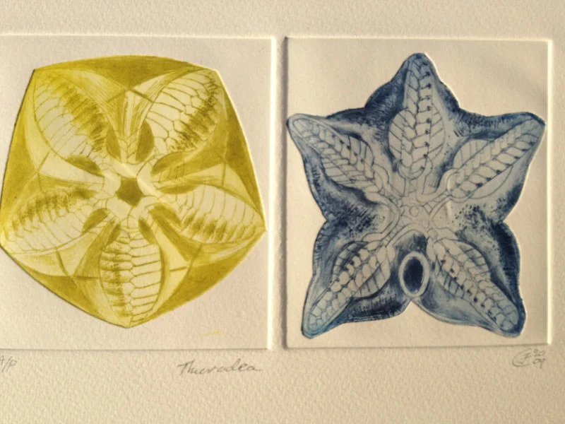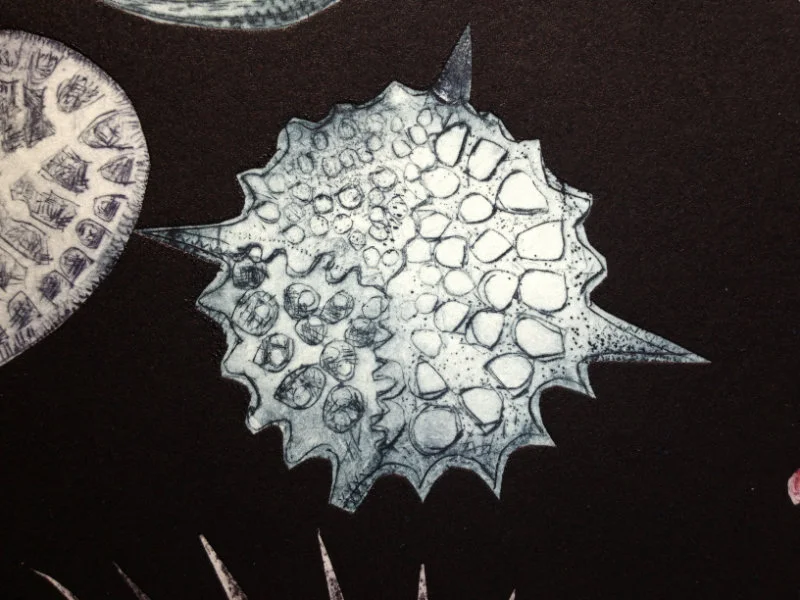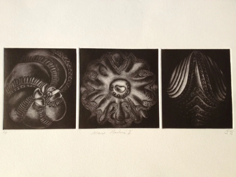 My recent etchings and mezzotints are inspired by the studies of microscopic marine animals drawn by the biologist Ernst Haeckel (1834 - 1919) for his book Kuntstformen der Nature (1904). I had been working with botanical forms in different media for twenty years creating what I call icons. Prior to that my subject matter was the human form which I used in my book cover illustrations for Virago and water colour paintings, often working from classical themes. As a student I based my final degree work on 19th Century drawings of insects and crustaceans. The artists who especially inspired me then were Hieronymus Bosch and Max Ernst.