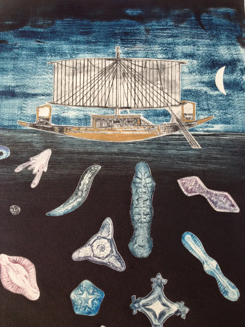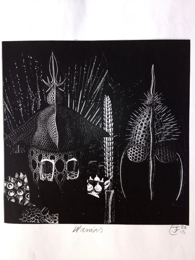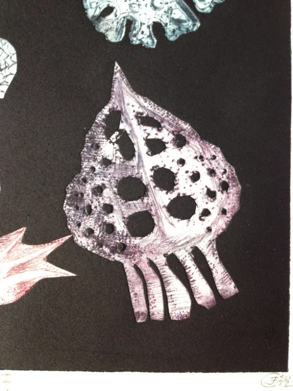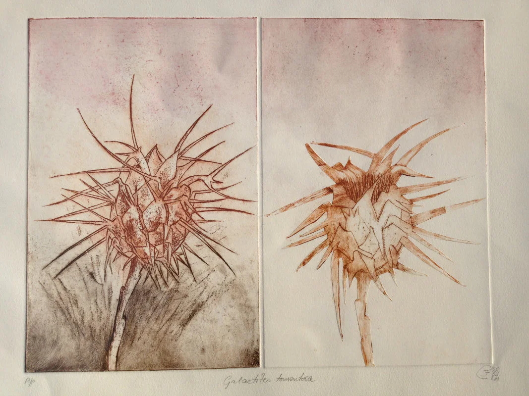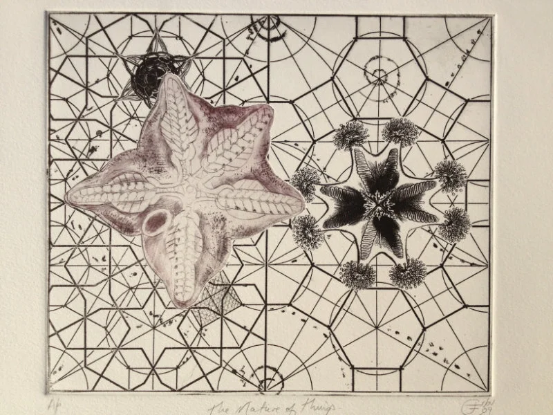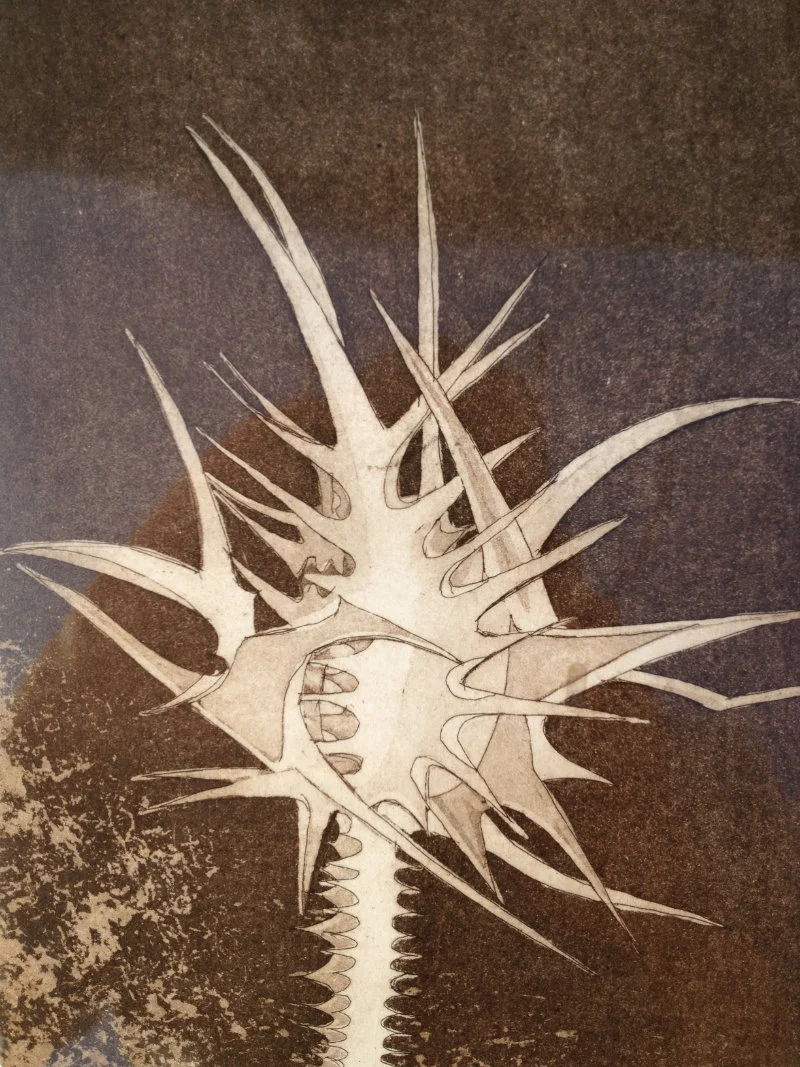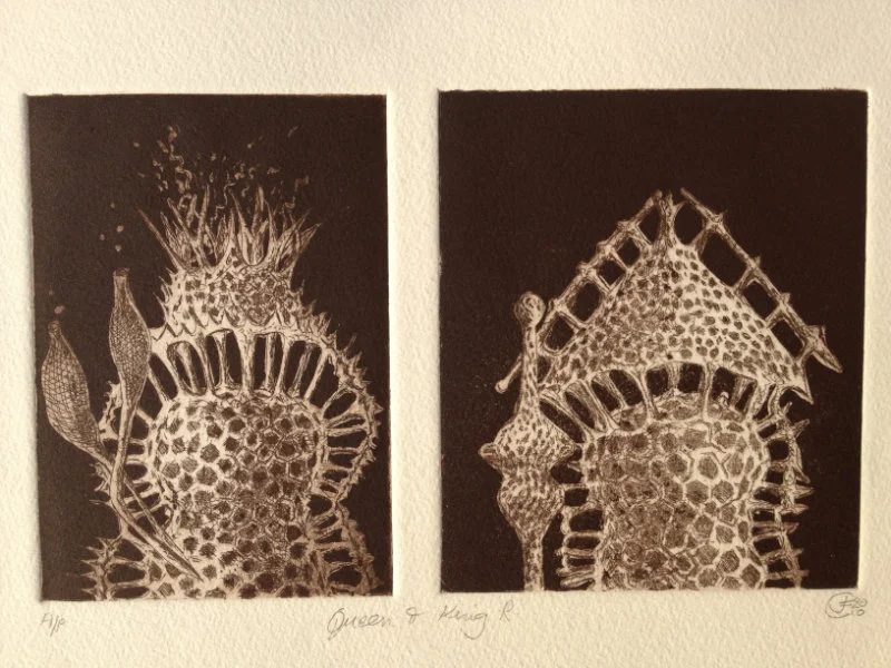 My recent etchings and mezzotints are inspired by the studies of microscopic marine animals drawn by the biologist Ernst Haeckel (1834 - 1919) for his book Kuntstformen der Nature (1904). I had been working with botanical forms in different media for twenty years creating what I call icons. Prior to that my subject matter was the human form which I used in my book cover illustrations for Virago and water colour paintings, often working from classical themes. As a student I based my final degree work on 19th Century drawings of insects and crustaceans. The artists who especially inspired me then were Hieronymus Bosch and Max Ernst.